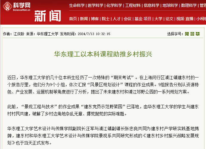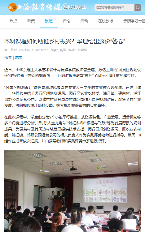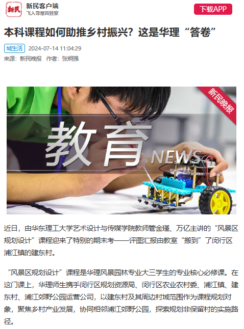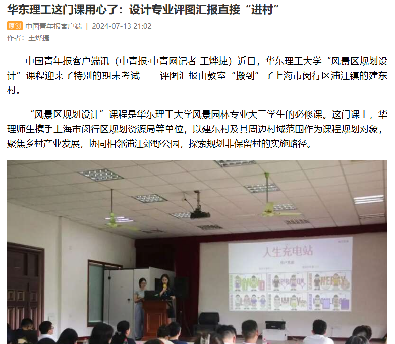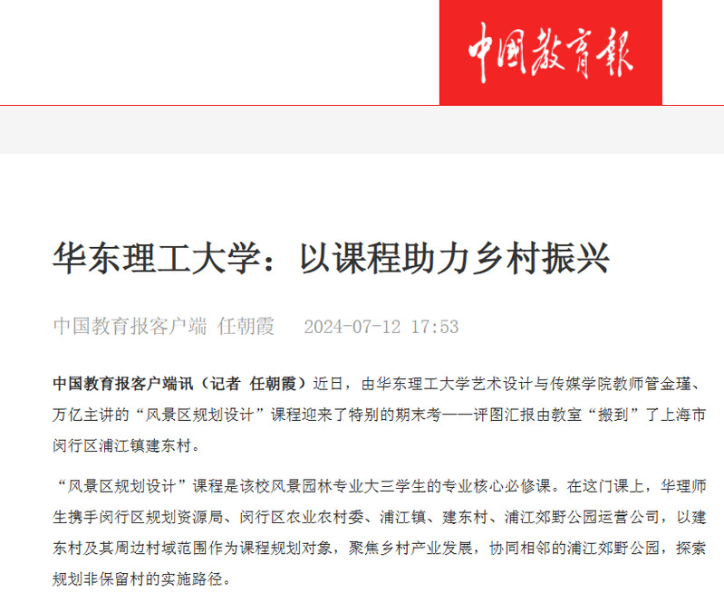 近日,华理“风景区规划设计”课程迎来了特别的期末考——评图汇报由教室“搬到”了闵行区浦江镇的建东村。在这门课上,华理师生以建东村及其周边村域范围作为课程规划对象,聚焦乡村产业发展,协同相邻浦江郊野公园,探索规划非保留村的实施路径。中国教育报客户端、中国青年报客户端、科学网、新民APP、上海科技报、第一教育、话匣子、广州日报新花城等媒体进行了原发报道。本篇选取了部分报道予以转载。