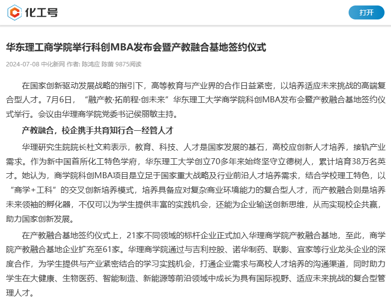 在国家创新驱动发展战略的要求下,高等教育与产业界紧密合作,才能有效培养适应未来挑战的高端复合型人才。7月6日,“融产教·拓前程·创未来”华东理工大学商学院科创MBA发布会暨产教融合基地签约仪式成功举行。中国青年报客户端、中国新闻网、中国社会科学网、科学网、中化新网、新民客户端、东方网、新民周刊、劳动观察、上海教育新闻网、上海科技报、上海热线、第一教育、话匣子、广州日报新花城、东方财经、上海教育电视台等近20家媒体进行了原发报道。
