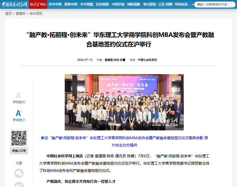 【中国社会科学网】“融产教·拓前程·创未来”华东理工大学商学院科创MBA发布会暨产教融合基地签约仪式在沪举行