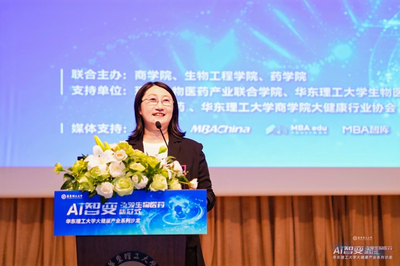 商学院党委副书记郑庆寰出席并发表致辞。她指出生物医药作为上海三大先导产业之一,正迎来空前的发展机遇。她提到,上海近期宣布成立的三大先导产业母基金,将合计投入890亿元资金,以支持生物医药等关键领域的创新与发展。她进一步强调,随着资金和政策的有力支持,生物医药行业将迎来新的发展机遇。AI技术的广泛应用将进一步推动产业变革与创新,为提升人类健康福祉水平、推动经济社会持续健康发展注入新动力。