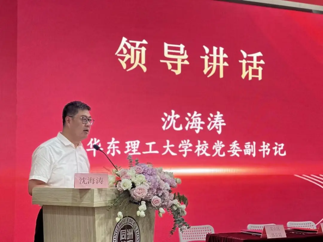 为深入贯彻“体育强国”国家战略,推动“体教融合”向纵深发展,加强体育后备人才的全链条培养,提升选才育才质量,华东理工大学携手宝山区教育局、体育局、上海存志高级中学及上海市同洲模范学校(上海存志学校集团成员校),于8月14日在同洲模范学校举行了“华理-宝山体教融合人才联合培养创新基地”共建签约仪式。宝山区副区长丁力,华东理工大学党委副书记沈海涛,宝山区教育局局长张治、体育局局长张彬,华东理工大学体育科学与工程学院党委书记徐文方、院长叶心明,存志学校集团理事长李懿等出席签约仪式。仪式由张彬主持。