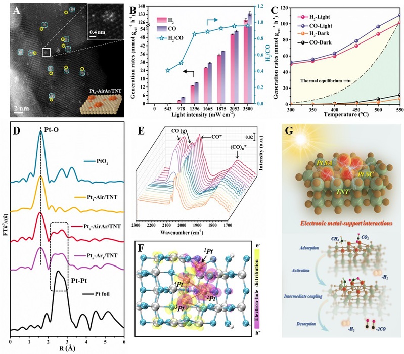 基于上述背景,张金龙教授团队运用离子交换和空间限域策略,对TiO2纳米管上的Pt位点进行原子级调控,诱导局部电荷重排,促进了反应物分子在活性位点的定向吸附与活化,在光驱动下实现了高效稳定的甲烷干重整。其中,该团队构筑的Pt单原子 (SA) 和Pt亚纳米团簇 (SC) 共修饰样品Ptn-AirAr/TNT,在光驱动DRM反应中表现出高达34.41 mol gPt-1 h-1的合成气生成速率和接近1:1的H2/CO,打破了传统热催化的局限性。该研究凭借X射线吸收光谱(XAFS)、原位红外漫反射光谱(DRIFTS)及激发态计算等先进表征手段,深入解析了不同Pt位点修饰样品中电子-金属-载体之间的相互作用。研究表明,单原子和团簇的特殊结构所诱导的界面电荷重排和电子金属-载体相互作用增强了反应物及中间体转化,Pt SA与Pt SC合适的距离促进了C=O偶联,有效抑制了副反应,促进了H2和CO的高效稳定生成。该工作阐明了活性位点与界面态调控在DRM反应中的重要作用,为在原子尺度上探究多分子反应体系提供了指导。