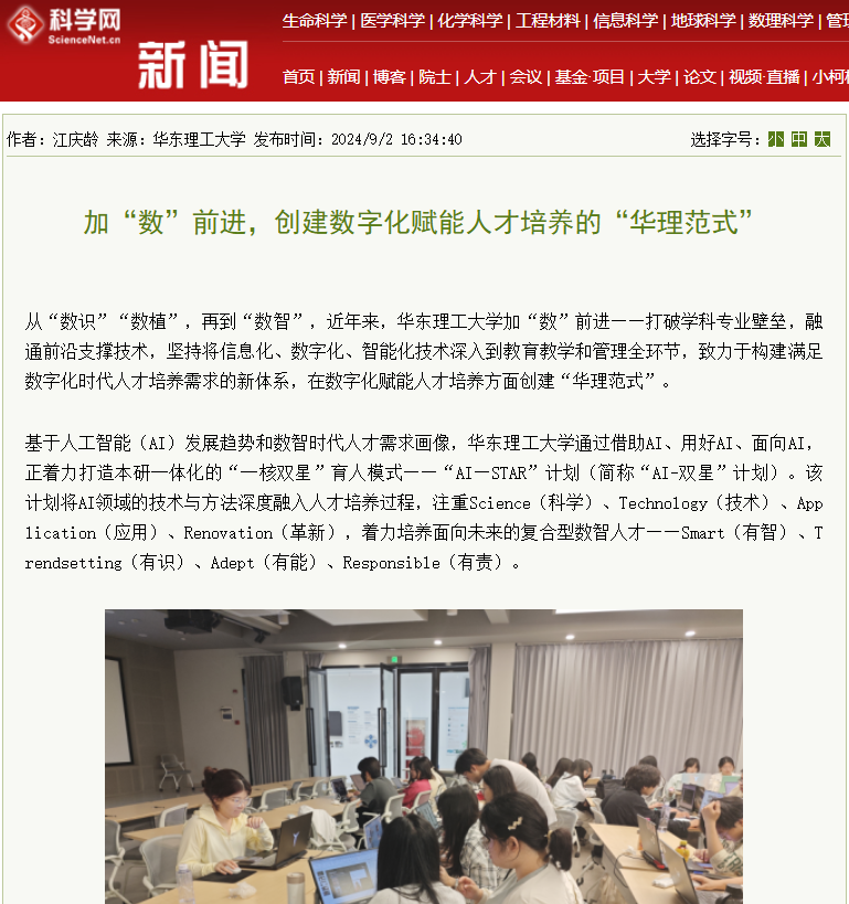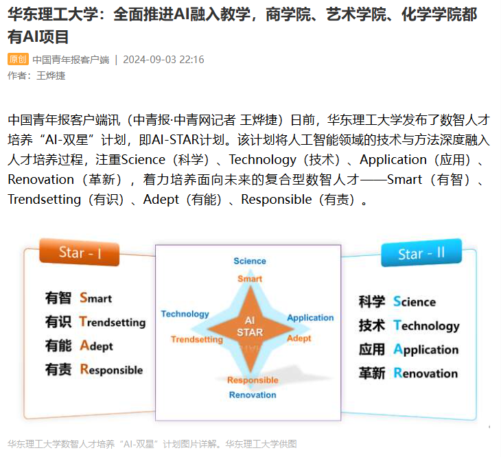 中国青年报客户端讯(中青报·中青网记者 王烨捷)日前,华东理工大学发布了数智人才培养“AI-双星”计划,即AI-STAR计划。该计划将人工智能领域的技术与方法深度融入人才培养过程,注重Science(科学)、Technology(技术)、Application(应用)、Renovation(革新),着力培养面向未来的复合型数智人才——Smart(有智)、Trendsetting(有识)、Adept(有能)、Responsible(有责)。