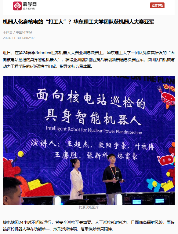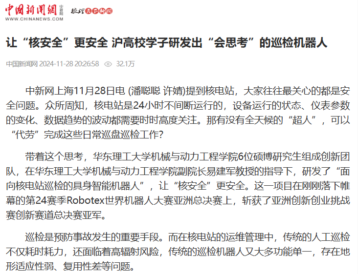 近日,我校机械与动力工程学院的6位硕博研究生组成创新团队,在易建军老师的指导下,研发了“面向核电站巡检的具身智能机器人”,让“核安全”更安全。这一项目在第24赛季Robotex世界机器人大赛亚洲总决赛上,斩获了亚洲创新创业挑战赛创新赛道总决赛亚军。中国青年报客户端、中国新闻网、科学网APP、文汇APP、《新民晚报》、新民客户端、东方网、上海教育新闻网、上海科技报、话匣子、广东日报新花城等10余家媒体进行了原发报道。本篇选取了部分报道予以转载。