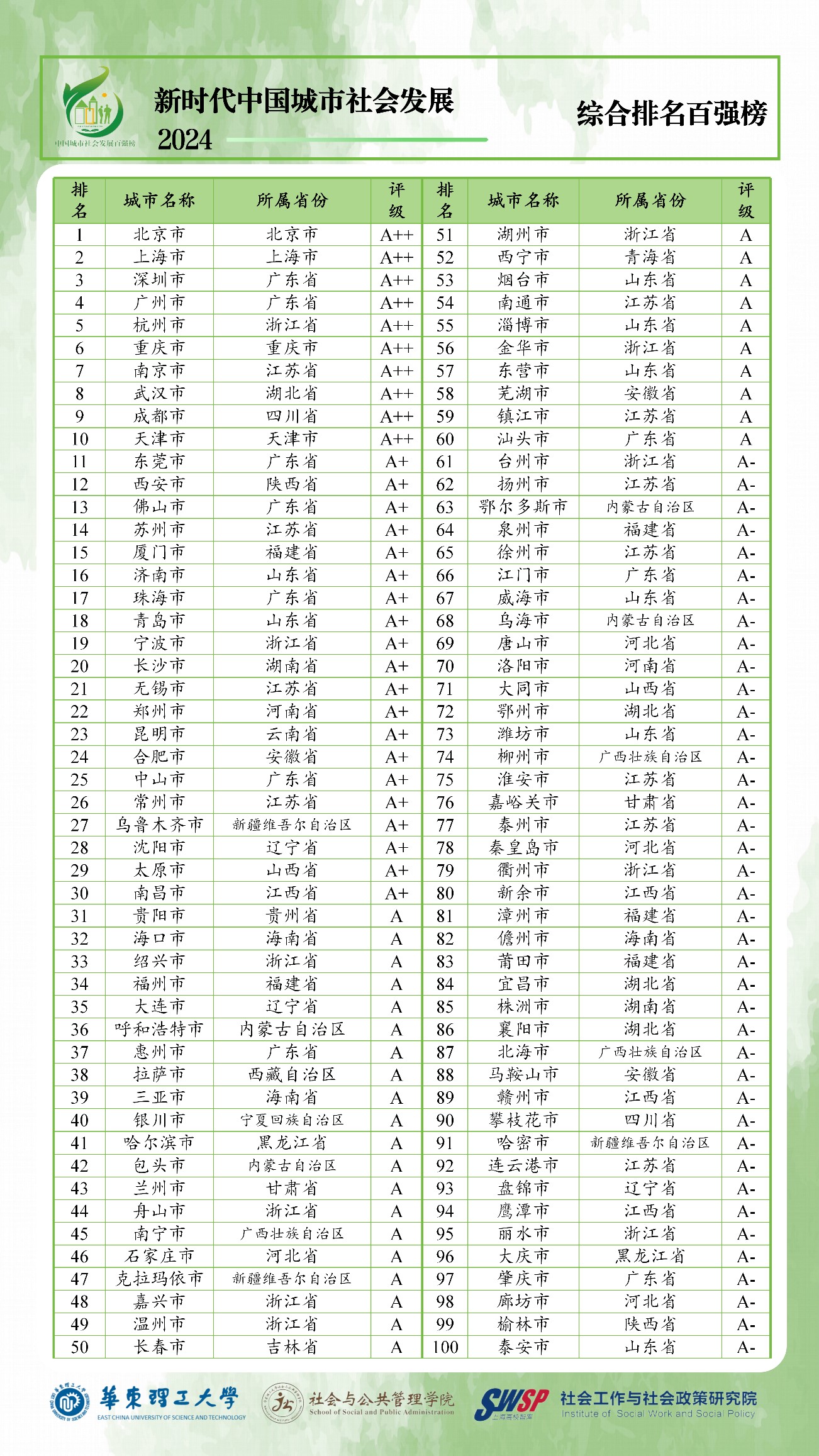 12月25日,上海高校智库“华东理工大学社会工作与社会政策研究院”何雪松教授领衔的智库重点研究项目“中国城市社会发展指数研究”课题组在沪线上发布“新时代中国城市社会发展指数暨百强榜(2024)”,这是华东理工大学持续第七年公开发布中国城市社会发展百强榜。课题组后续还将围绕中国城市社会发展一级指标推出专题报告。