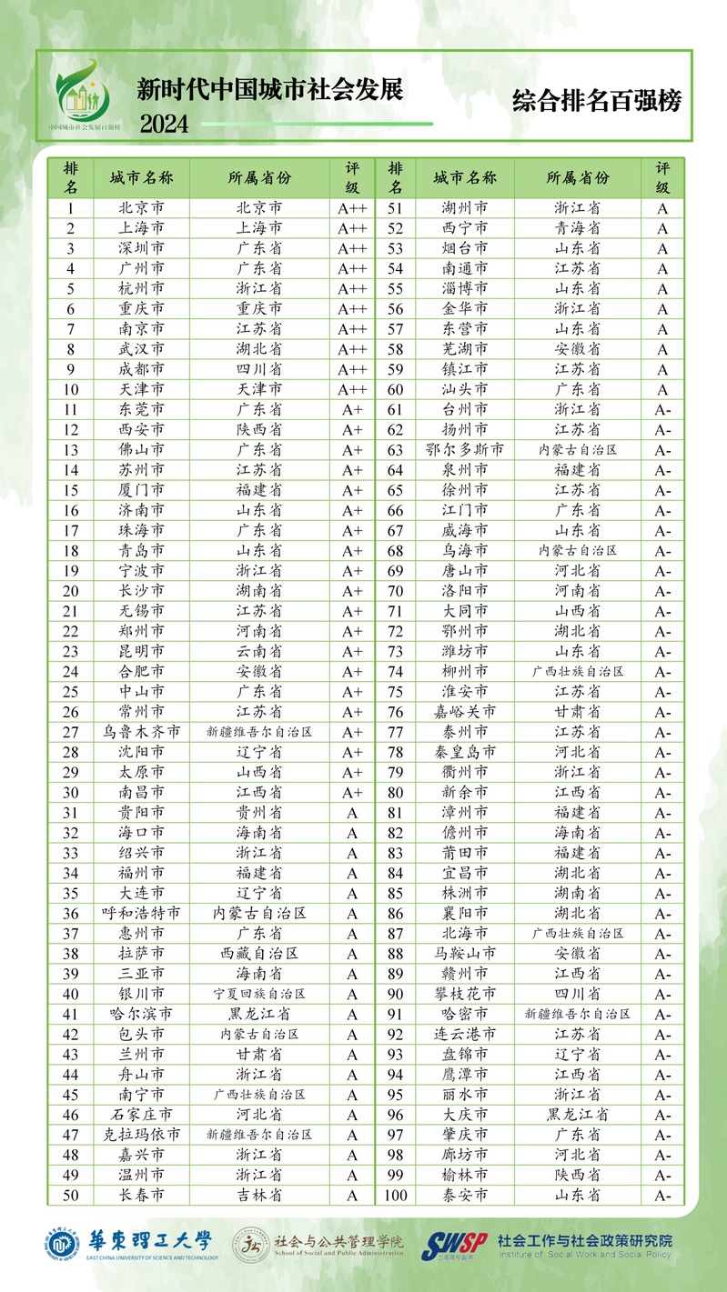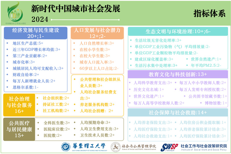 12月25日,上海高校智库“华东理工大学社会工作与社会政策研究院”对外公布新时代中国城市社会发展指数暨百强榜(2024)。2024年中国城市社会发展指标体系是综合反映城市社会发展与民生福祉的系统性指标,在长期关注城市社会治理、社会保障、人口发展、以及生态文明的基础上,更加重视城市的经济发展与民生建设、教育文化与科技创新,更加关注城市经济社会的可持续发展。课题组特别强调经济持续稳定增长、社会充分就业和人民生活品质提升对城市社会可持续发展的重要性。