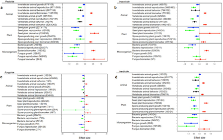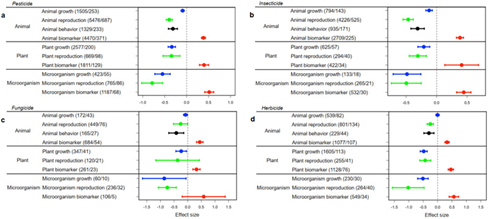 该研究将非靶标动物分为无脊椎动物和有脊椎动物,将植物分为单子叶和双子叶植物,将微生物划分为真菌和细菌,发现杀虫剂、杀菌剂、除草剂的负面效应同样存在(图3)。将农药划分为化学农药、矿物源农药、生物农药,以及按照欧盟标准,将农药分为“老药”和“新药”,这些负面效应清晰可见。此外,将非靶标生物分为“模式生物”和“非模式生物”后,农药的负效应依旧呈现。