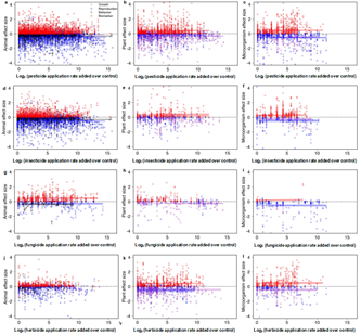 研究进一步利用回归方程模型量化农药使用剂量与非靶标生物各指标值的关系,结果显示:随着农药剂量的加大,杀虫剂、杀菌剂、除草剂对非靶标动物、植物、微生物的负面效应逐渐加剧(图4)。
