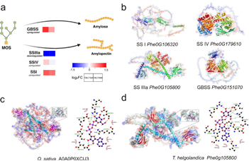 范建华教授课题组基于Nanopore三代测序技术获得了61.03Gb的测序数据,并利用Hi-C辅助组装将这些数据成功获得染色体水平的高质量基因组。通过基因结构预测和基因功能注释,研究团队发现扁藻拥有一个包含大量重复序列、高度冗余的二倍体基因组。通过比较基因组学分析,发现扁藻和其他绿藻的共同祖先在大约距今1,017.1 Mya发生分歧。结合组学数据,研究团队发现光暗节律导致了淀粉合成途径关键酶Starch Synthase(SS)的整体上调,但抑制了SS Ⅲa编码基因Phe0G105800的表达,这导致了总淀粉含量提高和直链淀粉的大量积累。