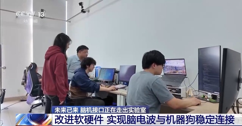 走近测试现场以后记者看到,刘力菲的头上除了智能眼镜之外,还戴着一个脑电帽,也就是脑电信号的采集装置。而在机器狗的身上,也背着由无线传输、解码运算等模块组成的脑机接口指令系统。正是依靠这套系统,刘力菲能够用自己的想法轻松控制机器狗。
