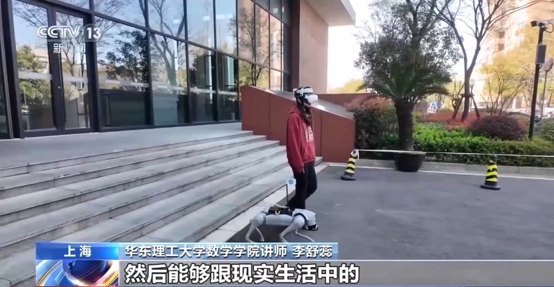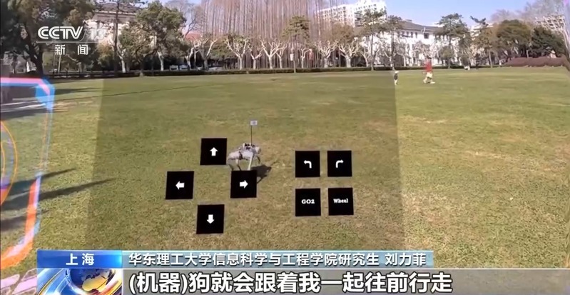 原地踏步、直行、转弯……这段时间在华东理工大学徐汇校区大草坪上,老师和学生们经常能看到,一只大约40厘米高的机器狗,跟在一名头戴智能眼镜的女生身边走来走去。这位戴着智能眼镜遛机器狗的女生是学校脑机接口及控制团队的研究生刘力菲,她和团队成员正在进行“面向四足控制的混合现实增强脑机接口系统”的测试。