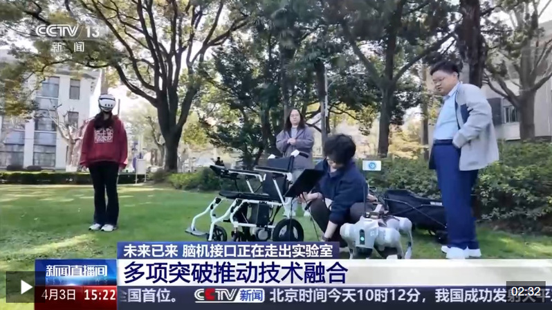 目前,在混合现实技术的支持下,混合现实增强脑机接口系统已经能够实现一套系统对两个设备的同时控制,演示测试中,刘力菲先是以脑控的方式控制电动轮椅行进到机器狗的旁边,然后再控制机器狗向前行进。