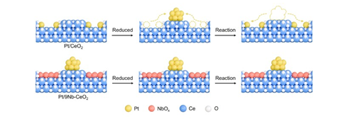 本研究揭示了Pt/CeO2催化剂在丙烷完全氧化反应中的活性衰减机制:Pt纳米团簇在工况条件下转化为催化惰性的单原子“旁观者”是导致失活的根本原因。研究团队提出了一种基于NbOₓ修饰的界面工程的策略,这种策略中,NbOₓ对Pt物种状态的调控并不是直接与Pt相互作用,而是通过占据CeO2表面的强结合位点,暴露相对弱的Pt锚定位点,从而避免反应产物水诱导的Pt单原子化过程。保留的金属态Pt纳米团簇展现出显著增强的丙烷C-H键解离能力,使丙烷完全氧化反应速率提升37倍,同时改善其稳定性。该界面工程策略同时具有普适性,不仅可以拓展到促进CO氧化反应,还可拓展至其他贵金属催化剂在NbOₓ修饰CeO2体系中的设计。本研究不仅阐明了工况条件下抗分散及抑制单原子物种生成的重要性,更创新性地提出了通过界面调控保留金属活性团簇的概念,为负载型贵金属催化剂设计提供了新的理论依据。