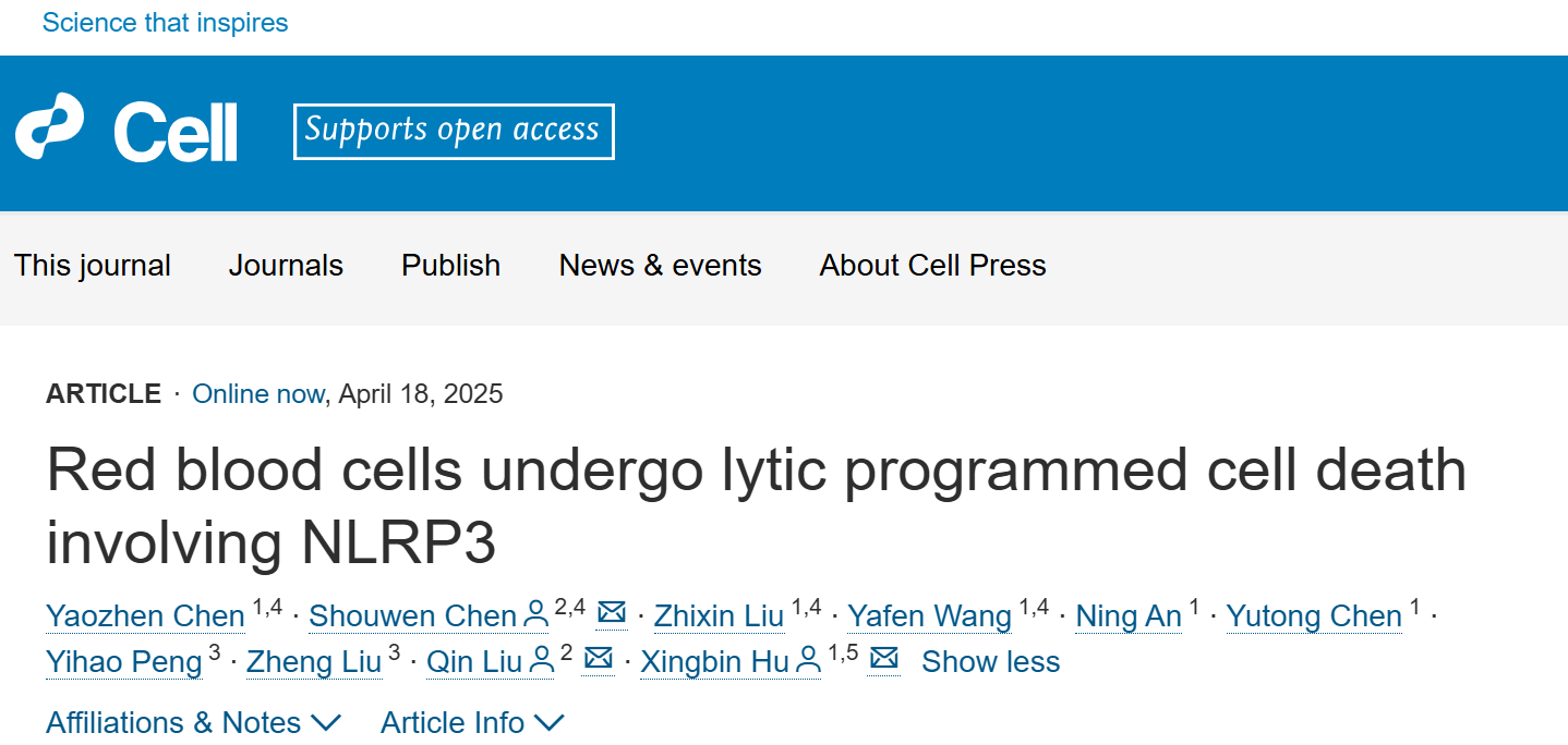 东方网记者朱雯4月20日报道:“氧气快递员”红细胞突然意外死亡,引发溶血性疾病,轻则导致疲劳、贫血,重则引发器官衰竭,原因何在?针对这一问题,华东理工大学刘琴教授团队联合空军军医大学附属西京医院胡兴斌副教授团队,揭示了一种红细胞程序性死亡的新机制。这项研究成果于4月18日登上了国际顶级期刊《Cell(细胞)》。