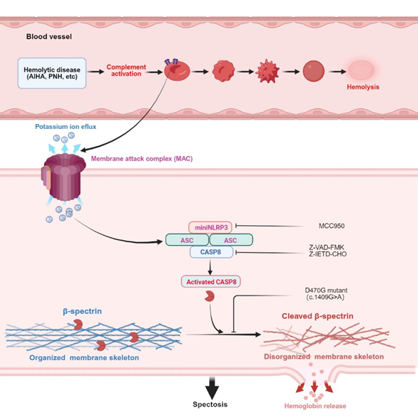 为了验证这一机制,团队进一步采用NLRP3和caspase-8特异性激活剂/抑制剂进行干预实验。研究首次证实,补体激活可触发红细胞内miniNLRP3-ASC-caspase-8信号通路级联反应,继而介导下游核心作用靶点血影蛋白β亚基(β-spectrin)的酶切裂解。作为维持细胞膜骨架的重要组成部分,β-spectrin的酶切降解直接导致膜骨架解体,由此引发溶血。研究团队将这一新型程序性死亡方式命名为“spectosis”。