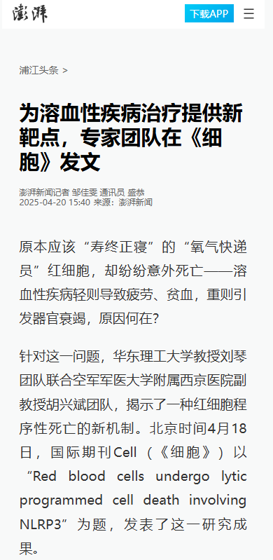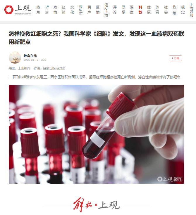 原本应该“寿终正寝”的“氧气快递员”红细胞,却纷纷意外死亡——溶血性疾病轻则导致疲劳、贫血,重则引发器官衰竭,原因何在?针对这一问题,我校刘琴教授团队联合空军军医大学附属西京医院副教授胡兴斌团队,揭示了一种红细胞程序性死亡的新机制,相关成果日前刊发于国际顶尖期刊《细胞》杂志。《文汇报》、人民日报客户端、解放·上观、中国新闻网、澎湃新闻客户端、科学网APP、东方网、新民·上观、新民周刊、上海徐汇、上海科技报、话匣子等10余家媒体进行了原发报道。本篇选取了部分报道予以转载。