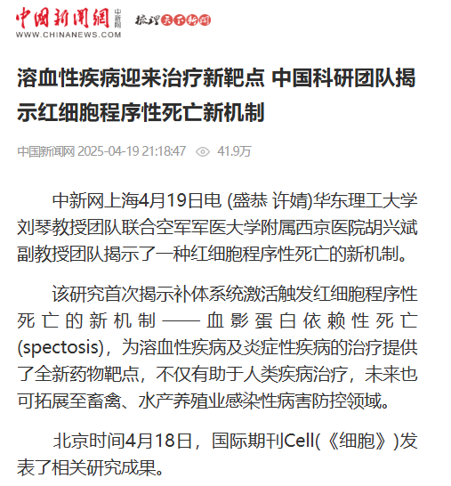 【中国新闻网】溶血性疾病迎来治疗新靶点 中国科研团队揭示红细胞程序性死亡新机制