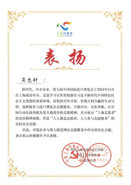 近日,中共上海市委社会工作部与共青团上海市委员会联合发布表扬信,对在第七届进博会志愿服务中做出突出贡献的个人予以表扬。资环学院2022级储能科学与工程专业吴忠轩同学表现优异,获评“第七届中国国际进口博览会优秀志愿者”称号,是全校唯一获此殊荣的同学。