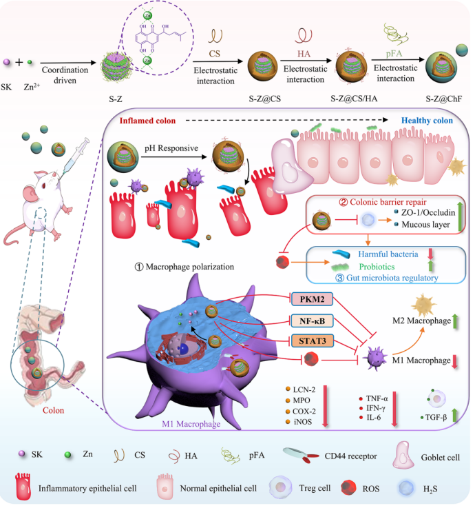 此外,高峰教授课题组在前期响应型纳米递药平台研究的基础上(J. Control. Release,2024,367,167;ACS Nano,2023,17,10113),在锌基配位纳米递药平台的设计,结肠病灶靶向递送和机制研究取得了最新进展,相关成果以“Incorporating zinc coordination driven nanozyme into chitosan and hyaluronic acid based nanoplatform for scavenging H2S/ROS in managing inflammatory bowel disease”为题发表在国际权威学术期刊Carbohydrate Polymers上。该研究开发了一种具有pH响应特性的聚阿魏酸[Poly(ferulic acid),pFA]材料,并联合课题组前期基础设计了一种用于实现紫草素和锌配位的纳米酶结肠炎症靶向的纳米递药平台,将锌基配位纳米酶靶向递送治炎症巨噬细胞内,调控ROS和细胞极化水平,并缓解炎症指标。此外,该纳米递药平台可通过调控H2S水平进一步实现结肠上皮屏障和菌群的恢复。同时,该研究也通过转录组学等技术进一步表明纳米递药平台对相关炎症通路(NF-κB,PKM2及STAT3等),和促炎酶水平(MPO,COX-2及iNOS等)等致病因素的多模态调控潜力。相关纳米递药平台在重编程炎症肠道微环境的同时,具有良好的生物安全性,为IBD的治疗提供了新策略。药学院博士研究生邹佳峰、硕士研究生丁文星为该论文共同第一作者,高峰为论文通讯作者。