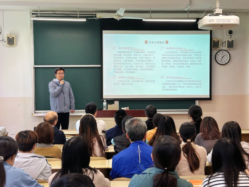 4月25日下午,商业管理有限公司党委在七教201室举办深入贯彻中央八项规定精神学习教育专题辅导报告会。我校马克思主义学院王阳副教授作了题为“新型政党制度:历史使命、现实困境与实践突破”的专题辅导报告。商业管理有限公司党委班子成员、全体党员参加了报告会,会议由商业管理有限公司党委副书记姚磊主持。