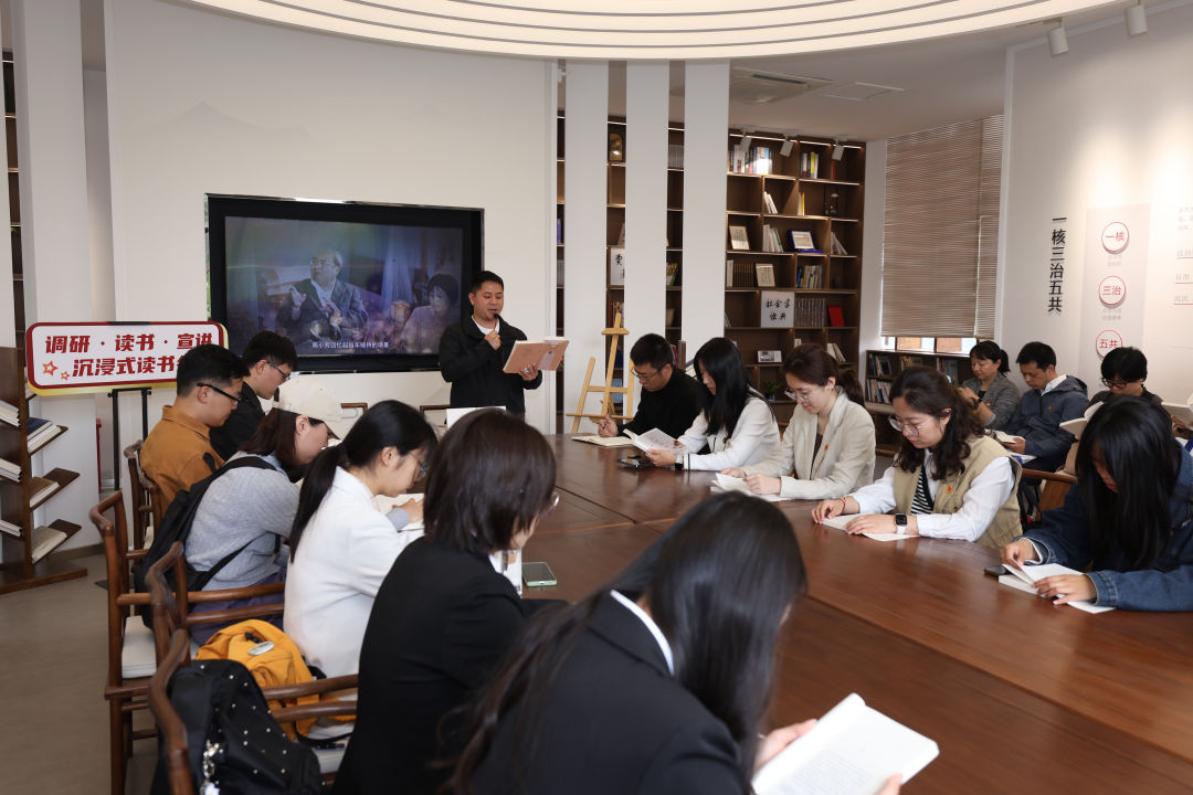 在费孝通图书馆,社会与公共管理学院专门研究乡村发展的博士生佘国梁担任领读人,带领同学们深度研读《江村经济》。通过对“蚕丝业改革困境”“土地制度变迁”等章节的细致解读,大家深刻领悟费孝通“志在富民”的学术初心,感受其对乡村工业发展与乡土伦理重建的民生关怀。同时,从费老晚年提出的“文化自觉”理论出发,引发了对社会学本土化研究范式创新和中国自主知识体系建构的深刻思考。佘博士还结合新时代江村数字化乡村治理、生态农业发展等案例,阐释经典理论与江村实践对破解城乡融合发展、基层治理现代化等现实问题的启示。