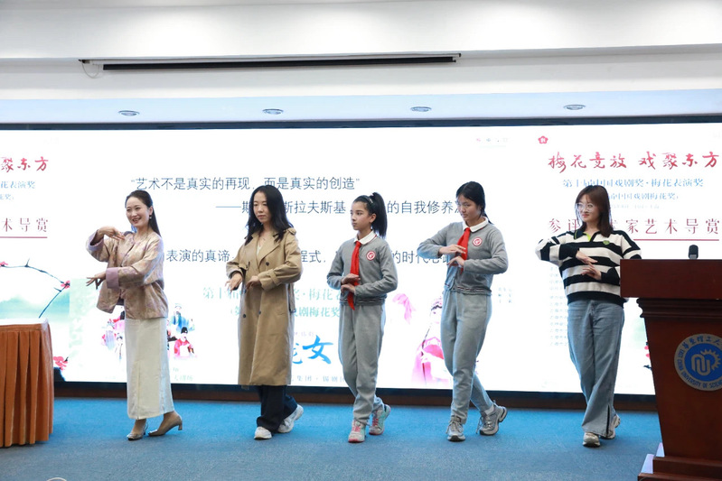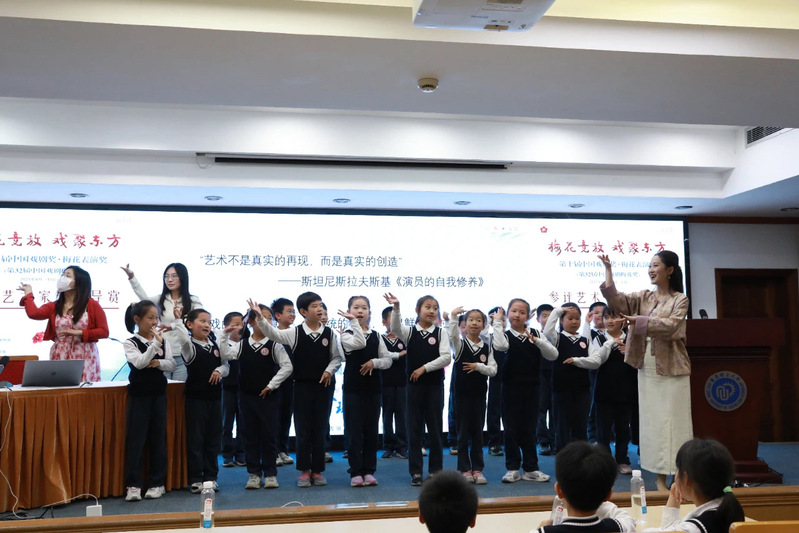 季春艳还现场教学了戏曲程式中的“照镜子”“出门”等动作身段,点燃了现场学生的热情,大家踊跃上台学习表演。本次大中小学生共赏一堂戏曲课,是传承中华文脉、培育文化自信的重要实践,课程在热烈掌声中落下帷幕。