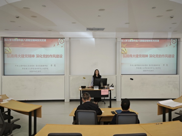 4月29日上午,信息科学与工程学院深入贯彻中央八项规定精神学习教育读书班专题辅导报告会在实验十九楼A101举行,徐汇区委党校党史党建教研室教师章慧老师作了题为“弘扬伟大建党精神 深化党的作风建设”的专题报告,学院领导班子成员和全体教师党员参会,会议由学院党委副书记兼纪委书记郭卫斌主持。