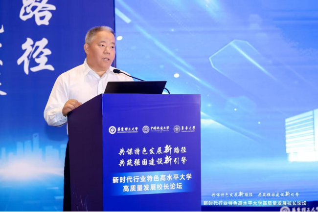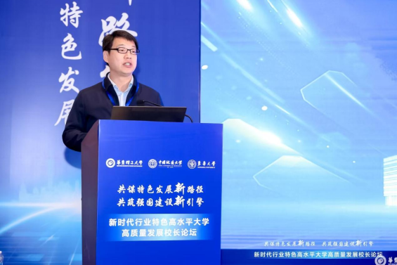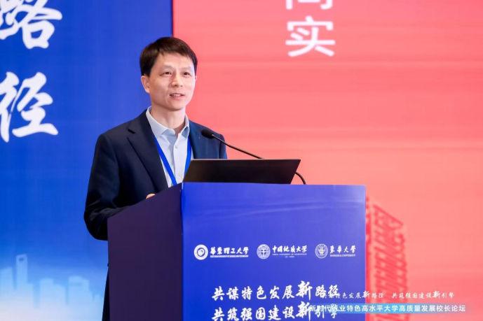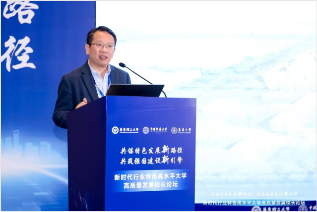 轩福贞代表主办方致辞,向长期关心支持行业特色高校发展的中央各部门、各地政府以及社会各界表示衷心感谢,并以《新产业,新大学——新时代行业特色高水平大学的转型与再回归》为题作了主旨报告。他从行业特色大学的发展历程谈起,强调行业特色大学是产业发展的重要战略支撑。他指出,新产业造就新大学,新大学成就新产业,随着新时代产业快速升级迭代,行业特色高水平大学担负着国家战略服务者、行业创新引领者、区域发展赋能者、国际竞争参与者四大核心使命,并已成为新产业、新质生产力供给者的重要高地。他以华东理工大学“缘化而立、依化而兴”的特色发展历程为例,介绍了学校全面实施现代化、数智化、绿色化、国际化的“四化”战略,纵深推进新能源新材料、大健康大安全的“两新两大”发展布局,以及在打造学科布局新结构、创造有组织科研新范式、构建卓越人才培养新模式、打造产学研合作新路径方面的发展举措。面对党的二十大提出的全面推进教育科技人才一体统筹发展的重要战略部署,他呼吁行业特色高水平大学,勇作“科技、教育、人才”一体改革发展新路径的探索者、先行者,协同攻关行业关键技术,大力培养实践型创新型高层次人才,以特色铸优势,以融合促创新,以担当显价值,努力成为服务经济社会高质量发展的引领者和生力军,在强国建设、民族复兴的新征程上作出更大贡献。