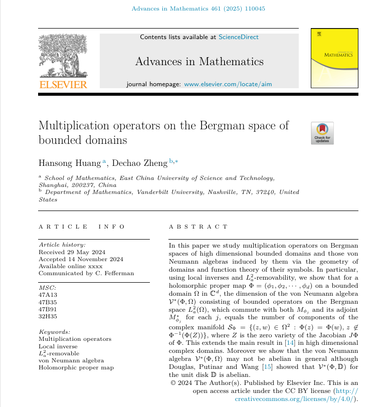 近日,数学学院黄寒松教授与美国范德堡大学郑德超教授在多重复变函数与算子代数交叉领域取得重要研究进展,其合作论文《Multiplication operators on the Bergman space of bounded domains》发表于数学领域知名期刊Advances in Mathematics(2025年第461卷)。该期刊为综合性数学权威刊物,致力于发表具有深刻理论价值与广泛影响力的原创成果。