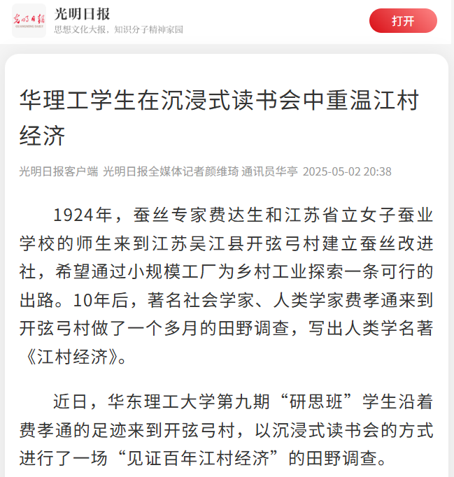 4月27日,华东理工大学第九期“研思班”研究生党支部书记循着先辈足迹,走进开弦弓村,以一场别开生面的沉浸式读书会,深度解构中国式现代化建设进程中的“江村经济”。光明日报客户端、中国青年报客户端、中国教育新闻网、新民·上观、上海热线、话匣子、上海教育新闻网、广州日报新花城等媒体进行了相关报道。部分媒体刊载如下。