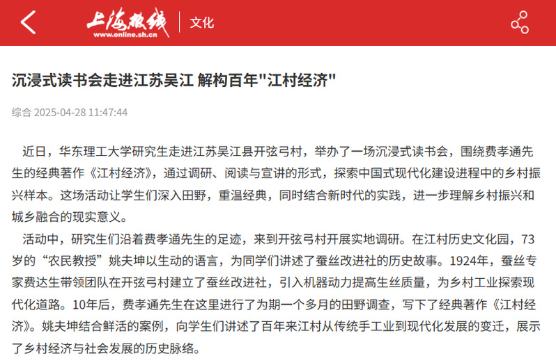 【新民·上观】华东理工大学举办沉浸式读书会和田野调查,见证“百年江村经济”