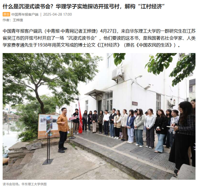中国青年报客户端讯(中青报·中青网记者王烨捷)4月27日,来自华东理工大学的一群研究生在江苏省吴江市的开弦弓村开启了一场“沉浸式读书会”,他们要读的这本书,是我国著名社会学家、人类学家费孝通先生于1938年用英文写成的博士论文《江村经济》(原名《中国农民的生活》)。