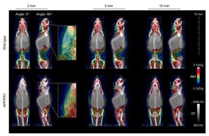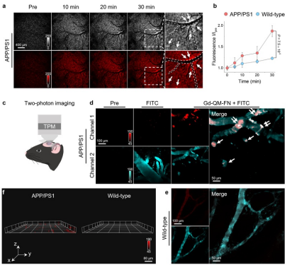基于此染料分子创新策略开发的QM-FN-DOTA探针,在活体Aβ检测中成功实现了:动态可视化示踪:通过脑部双光子荧光显微成像,实时监测探针穿越脑血屏障并点亮Aβ斑块全过程;空间定位与定量检测:MRI精准定位脑部海马区与皮层斑块空间分布,PET-CT定量分析正常鼠与AD鼠脑部摄取;跨模式多物种验证:在比格犬模型中证实探针的BBB穿透性与临床兼容性,为转化医学奠定基础。