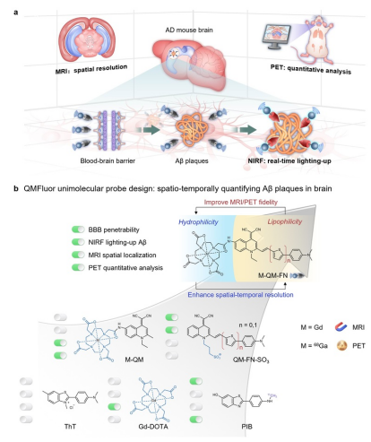 该研究基于喹啉腈染料母体“QMFluor”首创“一体化Aβ探针”,实现活体大脑中淀粉样斑块的近红外荧光(NIRF)、磁共振(MRI)及正电子发射断层扫描(PET)时空分辨动态成像,为阿尔茨海默症(AD)的病理机制解析和精准诊疗提供时空分辨检测新工具。