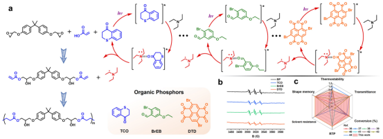 近年来,光固化材料因其快速固化、高精度成型和节能环保等特性,在3D打印、电子封装和医疗等领域得到广泛应用。然而,传统光固化材料在紫外光照射过程中始终呈现无色透明状态,导致难以通过肉眼直接观察其固化进程,给实时监测带来挑战。有机磷光分子对环境刚性变化具有高度敏感性,而光固化体系在固化过程中会发生显著的液-固相转变。将有机磷光分子引入光固化体系,可利用其磷光特性对固化过程进行实时可视化监测,这对优化光固化工艺具有重要意义。