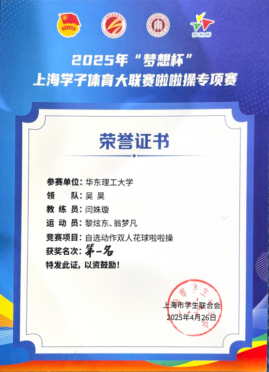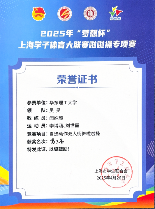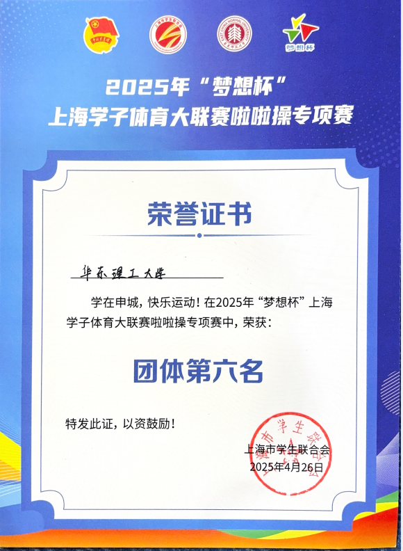 近日,由共青团上海市委员会、上海市教育委员会、上海市体育局指导的“梦想杯”上海学子体育大联赛啦啦操专项赛在华东师范大学闵行校区体育与健康学院篮球馆举行。本次“梦想杯”上海学子体育大联赛设有花球啦啦操、爵士啦啦操和街舞啦啦操三大赛事项目,来自全市41所高校的近700名选手热情参与。经过激烈角逐,我校代表队在双人花球啦啦操项目中取得第一名,在双人街舞啦啦操项目中取得第三名,我校也在此次专项赛中获团体第六名和优秀组织奖。