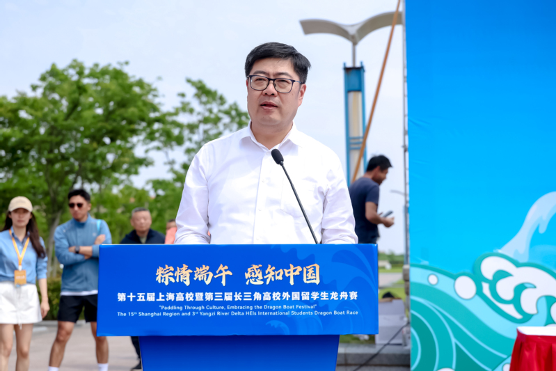 华东理工大学党委副书记沈海涛致欢迎辞。他表示华东理工大学已连续承办此项赛事15载,如今已发展成为上海及长三角地区外国留学生群体中最具影响力的年度体育盛事之一。他希望同学们通过本次龙舟赛,进一步感知中国、了解上海,在赛场上结下深厚友谊,在通海湖畔留下青春记忆,为促进文化交流和文明互鉴贡献青春力量。