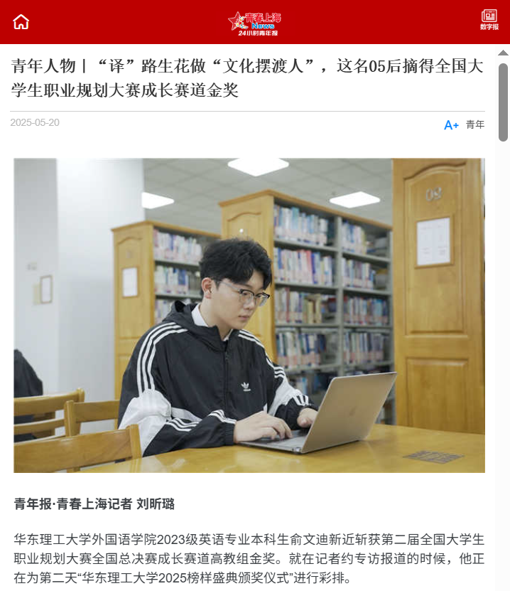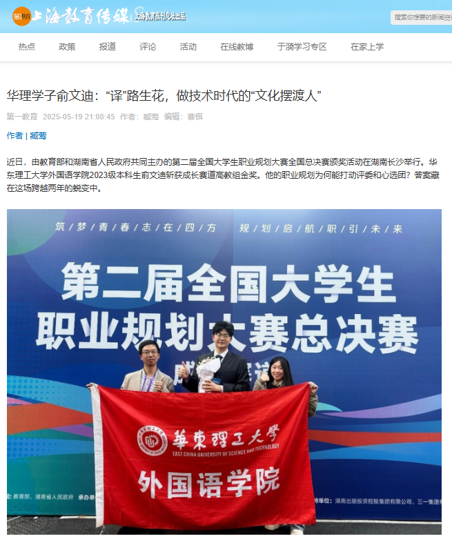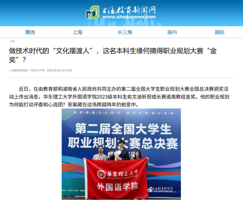 在第二届全国大学生职业规划大赛全国总决赛中,我校外国语学院2023级英语专业本科生俞文迪“译”路生花,最终斩获成长赛道高教组金奖。从迷茫到立志做技术时代“文化摆渡人”,他分享了这场跨越两年的蜕变。青春上海、科学网APP、新民·上观、上海教育新闻网、第一教育、上海科技报等多家媒体进行了原发报道。本篇选取了部分报道予以转载。