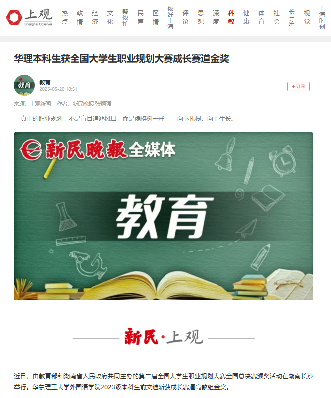 【新民·上观】华理本科生获全国大学生职业规划大赛成长赛道金奖
