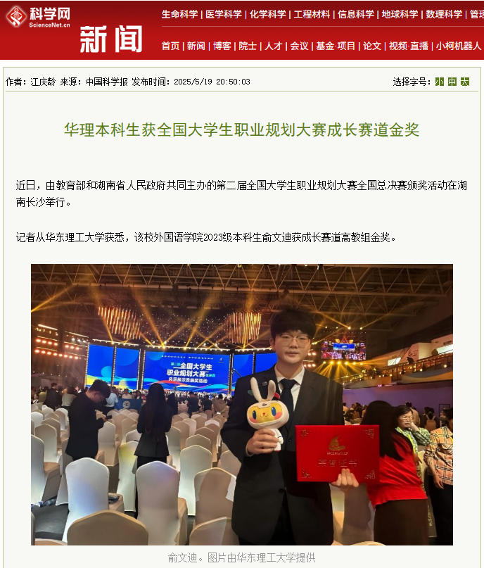近日,由教育部和湖南省人民政府共同主办的第二届全国大学生职业规划大赛全国总决赛颁奖活动在湖南长沙举行。华东理工大学外国语学院2023级本科生俞文迪斩获成长赛道高教组金奖。