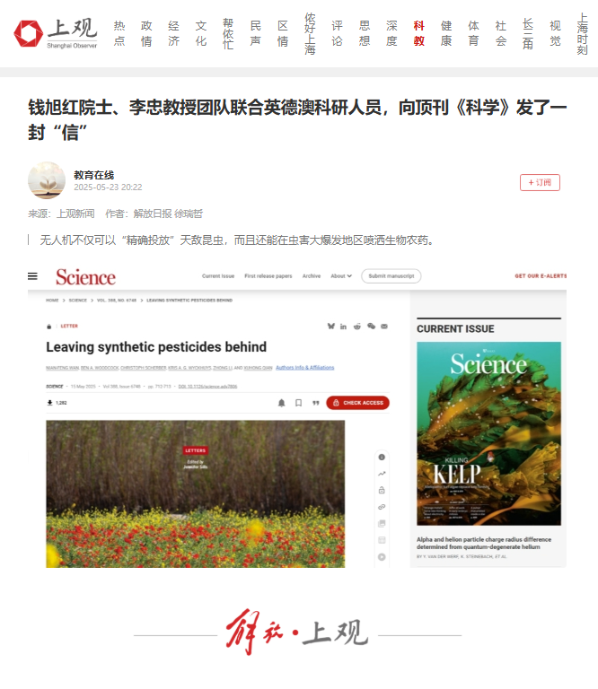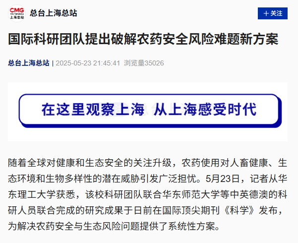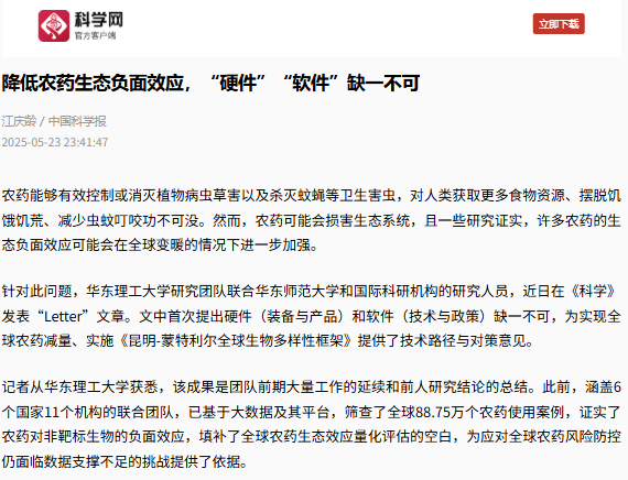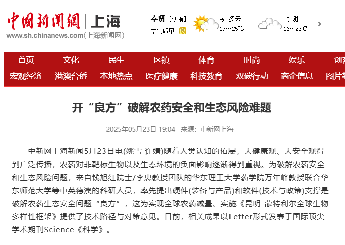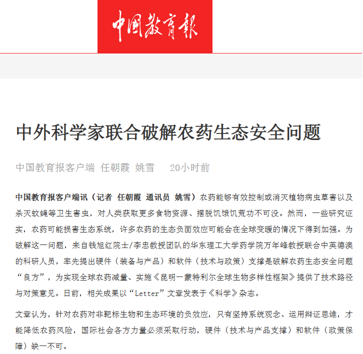 破解农药安全和生态风险问题,来自钱旭红院士/李忠教授团队的华东理工大学药学院万年峰教授联合华东师范大学等中英德澳的科研人员,率先提出硬件(装备与产品)和软件(技术与政策)支撑是破解农药生态安全问题“良方”,这为实现全球农药减量、实施《昆明-蒙特利尔全球生物多样性框架》提供了技术路径与对策意见。日前,相关成果以Letter形式发表于国际顶尖学术期刊Science《科学》。央视新闻客户端、中国教育报客户端、解放·上观、中国新闻网、科学网APP、上海科技报、新民周刊、第一教育、话匣子、广州日报新花城等多家媒体进行了原发报道。本篇选取了部分报道予以转载。
