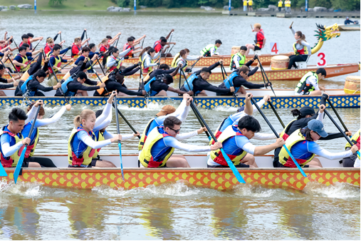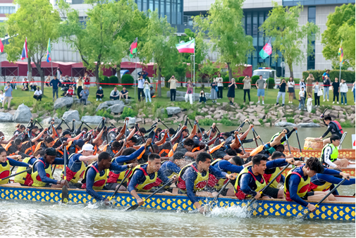 开赛前,颇具民俗风情的“舞龙舞狮”表演点燃了现场热情,民族舞则更让留学生们感受到了中国文化的多样性。随着发令声响,一条条龙舟如离弦之箭划破碧波,船桨翻飞间水花四溅,鼓声、呐喊声与岸边的欢呼声交织成一片。这些外籍选手紧握船桨,动作跟随鼓点整齐划一,奋力划动船桨,展现出“同舟共济、奋勇争先”的龙舟精神。岸边欢呼声、呐喊声、锣鼓声掀起一阵阵热浪,气氛十分热烈。