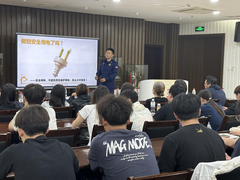 奉贤区星火消防救援站副站长叶志程首先以校园安全为主题对宿舍、实验室、体育场馆等环境下的安全用电、安全隐患排查、火灾应急处理、消防器材使用等内容进行了详细的讲解,并结合典型案例展示了如何进行火场逃生、如何防踩踏事件等。