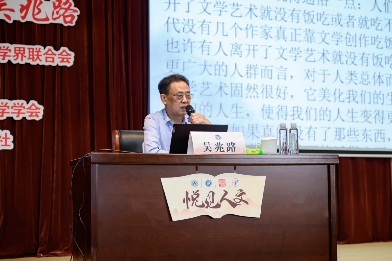 讲座伊始,吴兆路开宗明义,指出文学不仅是艺术表达形式,更是个人感知社会、提升素养的重要途径。他援引朱自清关于文学“懂得性、通人性、美”的三大特性,强调文学通过情感共鸣与思想启迪,帮助人们深化对世界的理解,提升审美品位与思辨能力。“体察宇宙之浩大,升华个体之卑微,光大人心之高贵,化解俗世之烦忧。”关于文学对于人生的作用,吴教授如是说。