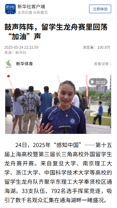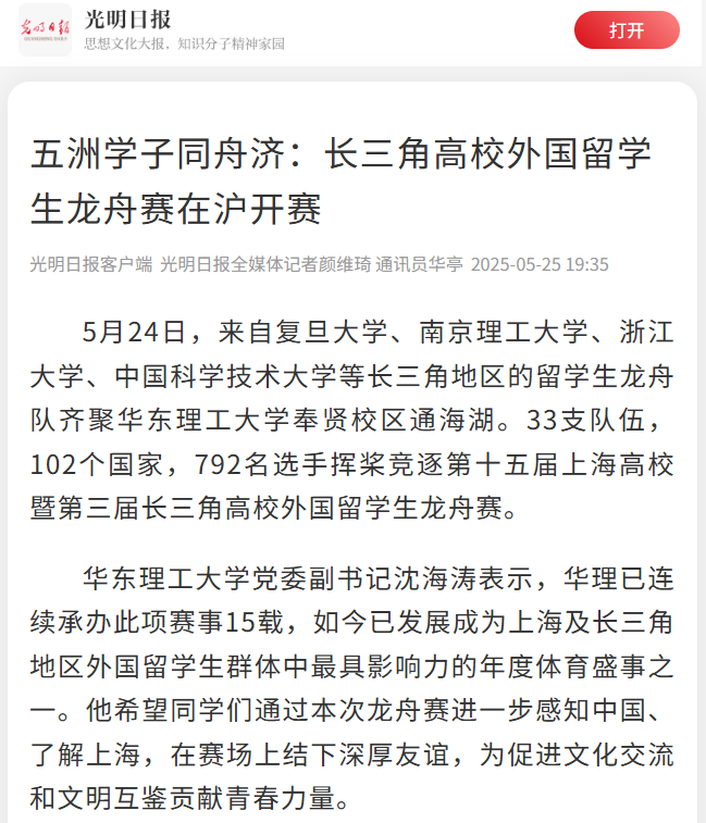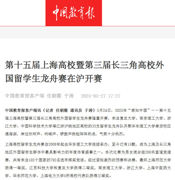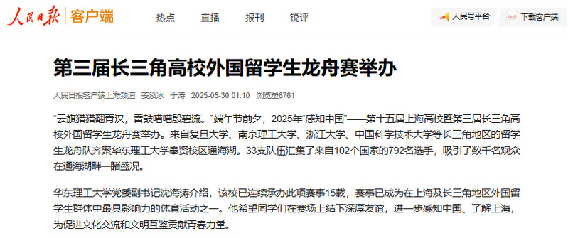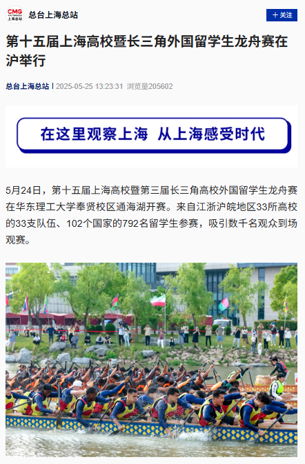 5月24日,来自江浙沪皖地区的留学生挥桨竞逐,33支队伍,102个国家,792名选手参加2025年“感知中国”——第十五届上海高校暨第三届长三角高校外国留学生龙舟赛。新华社、央视新闻客户端、人民日报客户端、光明日报客户端、CHINA DAILY、中国教育报客户端、中国新闻网、中国青年报客户端、解放·上观、文汇·上观、新民·上观、科学网、Shanghai Daily、《青年报》视频号、021视频、东方网、东方财经·浦东、第一教育、上海科技报、上海教育新闻网、广州日报新花城、劳动观察、话匣子、新民周刊、上海热线等近30家媒体进行了原发报道。本篇选取了部分报道予以转载。