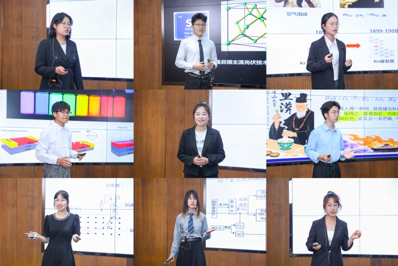 参赛学生紧扣演讲主题,围绕化学相关领域研究前沿,结合中国传统文化或自身研究课题,探索化学学科的美丽奥秘,讲好中国故事、发掘化学之美、感悟科研报国。化学类2402班赵睿以“众里寻他千百度,最适合CO₂的那个‘她’”为主题,从CO₂的分子结构、用途与危害讲起,并向大家介绍了高效率的电化学还原CO₂的催化剂。化学基地230班林诗怡带领大家深入了解惰性气体是如何撕破“绝对惰性”的标签,从元素周期表角落的“隐士”蜕变成未来科技“新星”,揭示了化学世界的无限可能。化学基地240班陆义桢向大家介绍了LED、OLED、QLED等技术背后的化学原理、发展历程以及应用潜力。化学基地230班张常捷通过对比钙钛矿太阳能电池和传统硅太阳能电池,探究钙钛矿电池的发展之路,展现了化学在新能源领域的创新突破。化学类2402李鸿睿带领大家探索MOF材料的无尽魅力,感受化学之美。化学基地240班王文煊引领大家循着历史的脉络,发掘中华文化中蕴含的智慧与现代科学精神深度碰撞的绚丽火花,彰显了文化与科学的交融之美。化学类2401班王琳为大家分享微观世界的光影魔术,在幽蓝与荧光的交响中,展现了科技如何照亮现实生活。化学类2401班吴思霖串联质谱技术百年传奇,从电子发现到多元应用,展示了其以高灵敏度与特异性成为解码物质的“科学之笔”。化学类2407班薛悦习围绕侯德榜的故事,带领大家感受精益求精的科研精神与舍我其谁的责任担当,传递了科学家精神的深刻内涵。