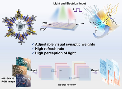 人工视觉神经系统通过整合图像感知、存储与计算功能,已成为突破冯·诺依曼瓶颈的潜力解决方案。基于现有光电忆阻器受限于需要特定波长或长时间输入才能维持稳定性能的缺陷,研究团队开发了一种苯并噻吩修饰的共价有机框架材料。该材料通过中等供电子基团(苯并三噻吩)和氧化还原活性基团(甲基三核铜)的有序限域分布,显著提升了甲基三核铜在低压(0.2V)氧化还原过程中的光电响应性能。快速的弛豫时间,结合电导的协同光电化学调制,即使在高速快门条件下,也能在短时间内有效地进行原位图像识别和存储,在弱光、浓雾及高频运动场景下实现识别精度的显著提升。该人工视觉神经系统经训练后,识别准确率从初始2种导电态时的7.1%跃升至87.1%。通过光电化学协同作用实现的50种导电状态使该器件的图像刷新率高达400Hz。这种构建策略与光电相互作用的协同效应,为开发能即时原位处理环境信息的光电神经形态计算元件提供了新路径。研究成果发表于InfoMat上。华东理工大学博士研究生张琼珊为论文第一作者,上海市智能感知与检测技术重点实验室张斌教授为通讯作者。