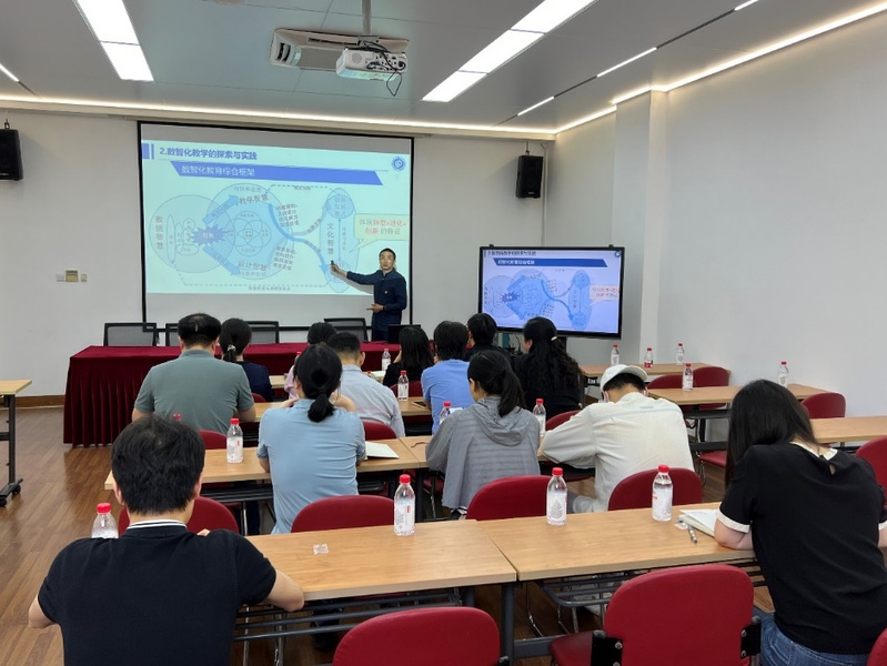 学院第一党支部组织委员姚俊围绕数智化赋能教学作主题分享,详细介绍了新时代高等教育质量要求,数智化教学的探索实践和建设情况。另外,还分享了我校在数智化教育方面就“AI-双STAR”数智课程体系建设、以知识图谱建设为核心的AI助教功能建设、AI智能体的教学应用、AI编程训练场等项目的探索和建设情况。同时,他还展示了利用在线教学平台开展混合式教学的具体案例,以及学习效果,一个个生动鲜活的案例让在场教师深刻感受到了数智化赋能教学的广阔前景与无限可能。