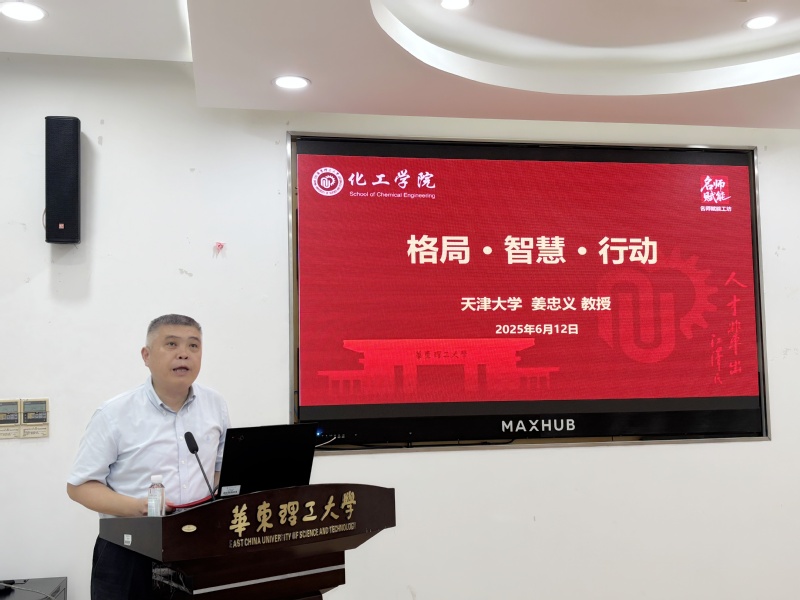 6月12日下午,化工学院名师赋能工坊首讲报告会在徐汇校区实验十六楼108室举行。天津大学姜忠义教授受邀作“格局・智慧・行动”专题报告,我校党委常委、副校长李涛主持会议,化工学院党委书记段学志、副院长宋震、青教联理事会会长江宏亮等80余名师生参会。