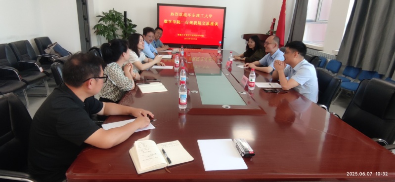 6月7日,鲍亮、林辉球一行赴新疆大学数学与系统科学学院进行调研。数学与系统科学学院院长赵建平、副书记谢洪利、副院长杨志霞等热情接待并出席座谈会。会上,双方围绕党建工作、学科建设规划、师资队伍优化路径、人才培养模式创新等议题展开深入探讨。双方分享了特色学科发展经验,针对学科评估、科研项目申报等难点问题交换了意见;就青年教师引进、培养机制及激励措施进行了经验交流;重点探讨了课程体系设置、学生实践能力提升等内容。双方一致表示,将以此次座谈会为契机,在学术资源共享、师生联合培养、科研项目合作等领域进一步深化合作,充分发挥各自优势,实现互利共赢,共同推动两院建设与发展迈向新高度。
